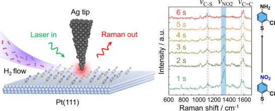 针对上述难题,蔡镇锋课题组基于在“表面反应过程原位表征”方向上的研究基础,与瑞士苏黎世联邦理工潘甜甜(ETH Zürich)的Naresh Kumar研究员与Jeremy O. Richardson教授合作,利用针尖增强拉曼光谱技术(Tip-enhanced Raman spectroscopy, TERS),结合模型表面体系与密度泛函理论(DFT)计算,成功实现了在Pt(111)单晶表面上分子氢活化及其驱动的卤代硝基苯硫酚(CNTP)选择性氢化反应的纳米级实时追踪。研究在单个纳米反应区间内(探测体积内分子数少于100个)直接观测到动态反应的特征振动演化过程,并在分子层面揭示了金属表面催化氢化的动力学过程。