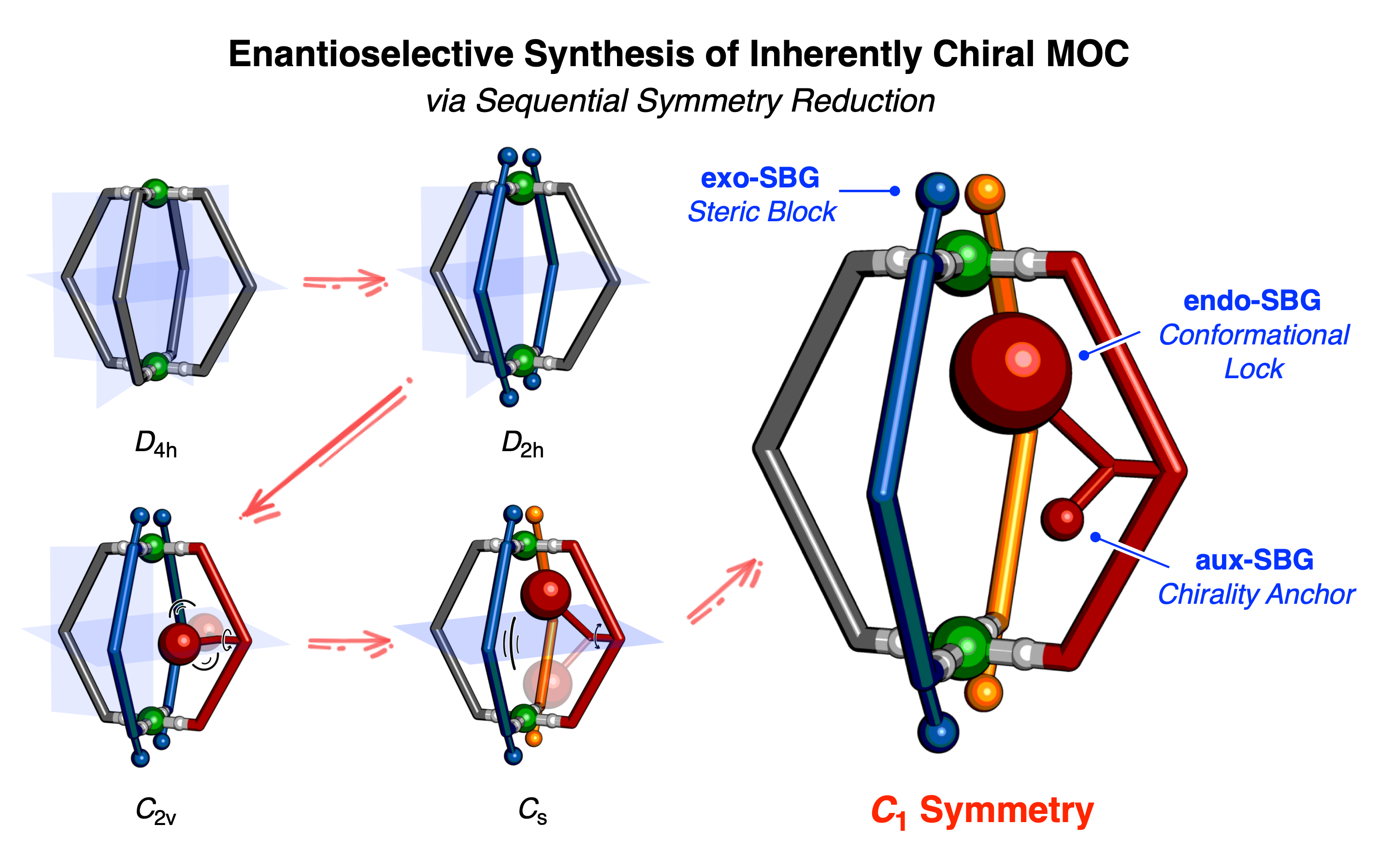 张琦课题组利用逐步对称破缺的策略,首次实现具有固有手性的C1对称超分子笼的对映选择性合成。该研究以D4h对称的Pd2L4金属有机笼为起点,通过依次引入一个腔外和两个腔内对称性破坏基团(SBG),系统地将对称性降低至D2h、C2v、Cs,最终获得C1对称结构。其中,腔内SBG带有中心手性,能够将手性有效地传递至整个笼状框架,从而驱动对映选择性组装。密度泛函理论计算与变温核磁共振实验进一步揭示了手性诱导的机理。通过更换不同的腔内SBG及内部官能团,成功构建了一系列具有手性空腔的结构,证明了该策略的通用性。初步的主客体研究表明,该类手性空腔能够结合中性及阴离子客体分子。空腔固有的不对称性可实现对手性客体的区分,并且其选择性可通过在空腔内引入小官能团进行精细调控。本研究发展了一种构建高度不对称限域纳米空间的普适性方法,为不对称催化与分子识别等领域提供了新的研究思路。