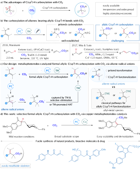 二氧化碳(CO2)是一种廉价易得、低毒可再生的理想碳一资源。利用其催化转化合成高附加值的羧酸化学品,变废为宝,具有重要意义。其中,CO2参与的C(sp3)–H羧基化反应兼具高原子经济性和步骤经济性,一直是该领域的重要研究方向。然而,由于CO2和C(sp3)–H这两者反应性低和选择性难调控等挑战,目前该类转化主要局限于苄位和羰基α位C(sp3)–H羧基化,反应类型和机制方面存在一定局限。另一方面,烯烃作为广泛应用的大宗化学品,其烯丙位C(sp3)–H选择性转化是实现烯烃高值化的重要途径。利用CO2参与烯丙位C(sp3)–H羧基化反应,可快速构建重要的丁烯酸类化合物,因而备受关注。然而,现有方法往往依赖紫外光或当量金属试剂等苛刻条件,导致底物类型局限、应用受限。因此,开发高效催化体系在温和条件下实现CO2参与烯丙位C(sp3)–H高选择性羧基化,是亟待解决的重要难题。