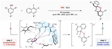该研究以“Atroposelective organocatalytic nucleophilic aromatic substitution for C–O bond construction”为题目发表在Nature Catalysis上。潘甜甜
